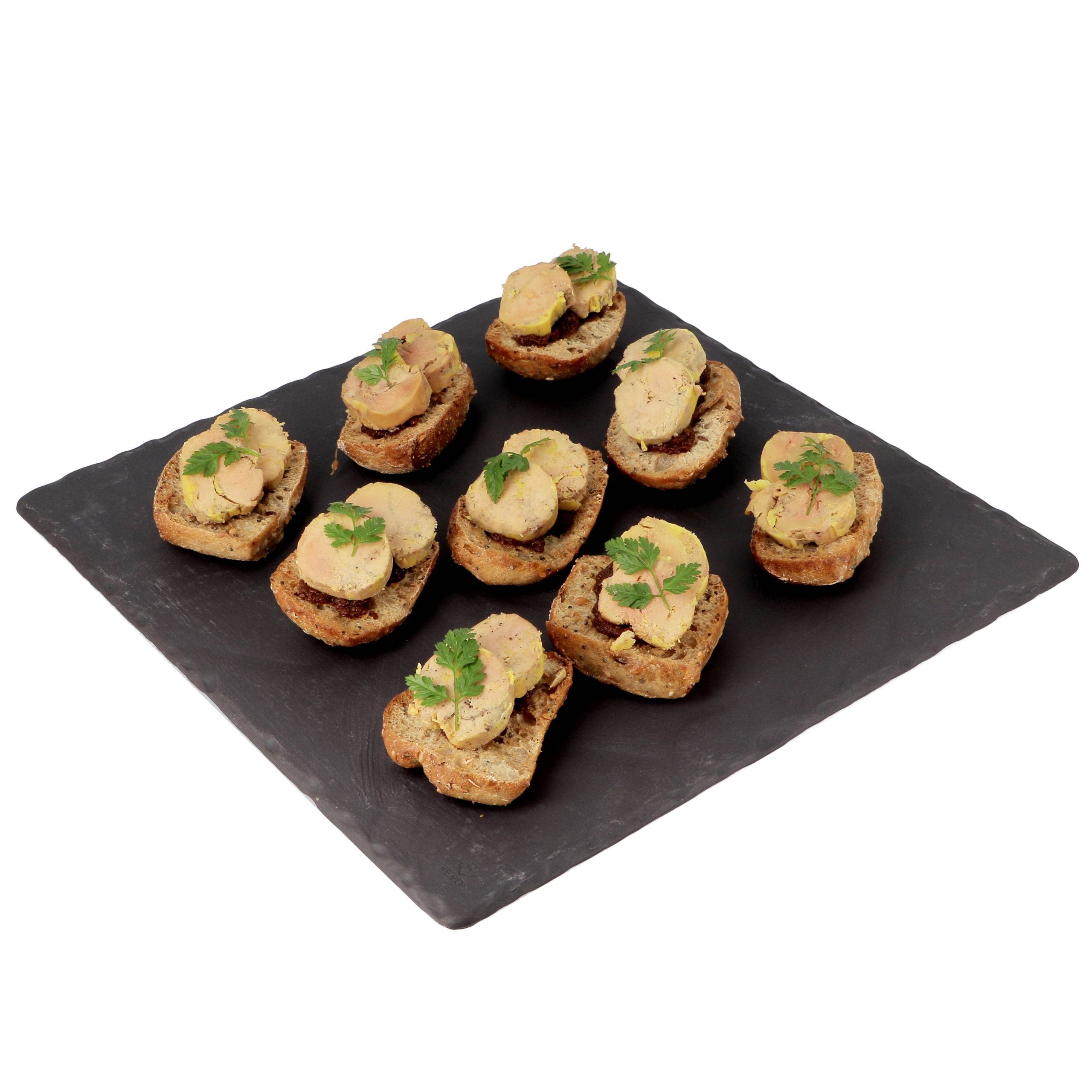 Dégustation de foie gras de canard entier mi-cuit sur toast brioché accompagnée de figues rôties