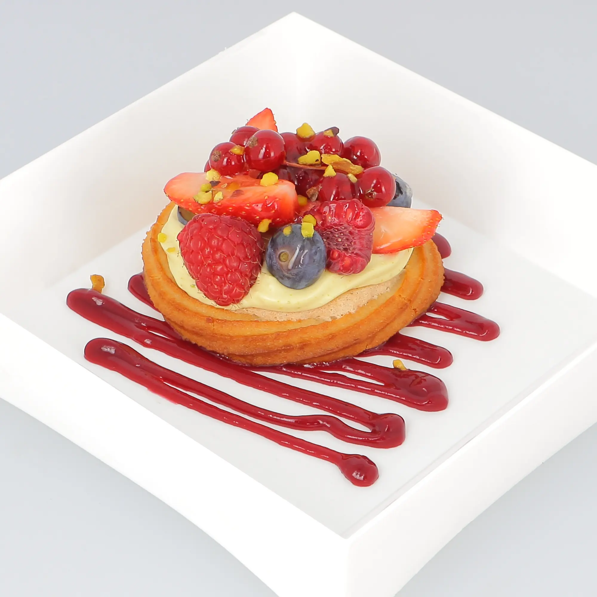 Biscuit moelleux aux amandes / crémeux pistache / fruits rouges panachés